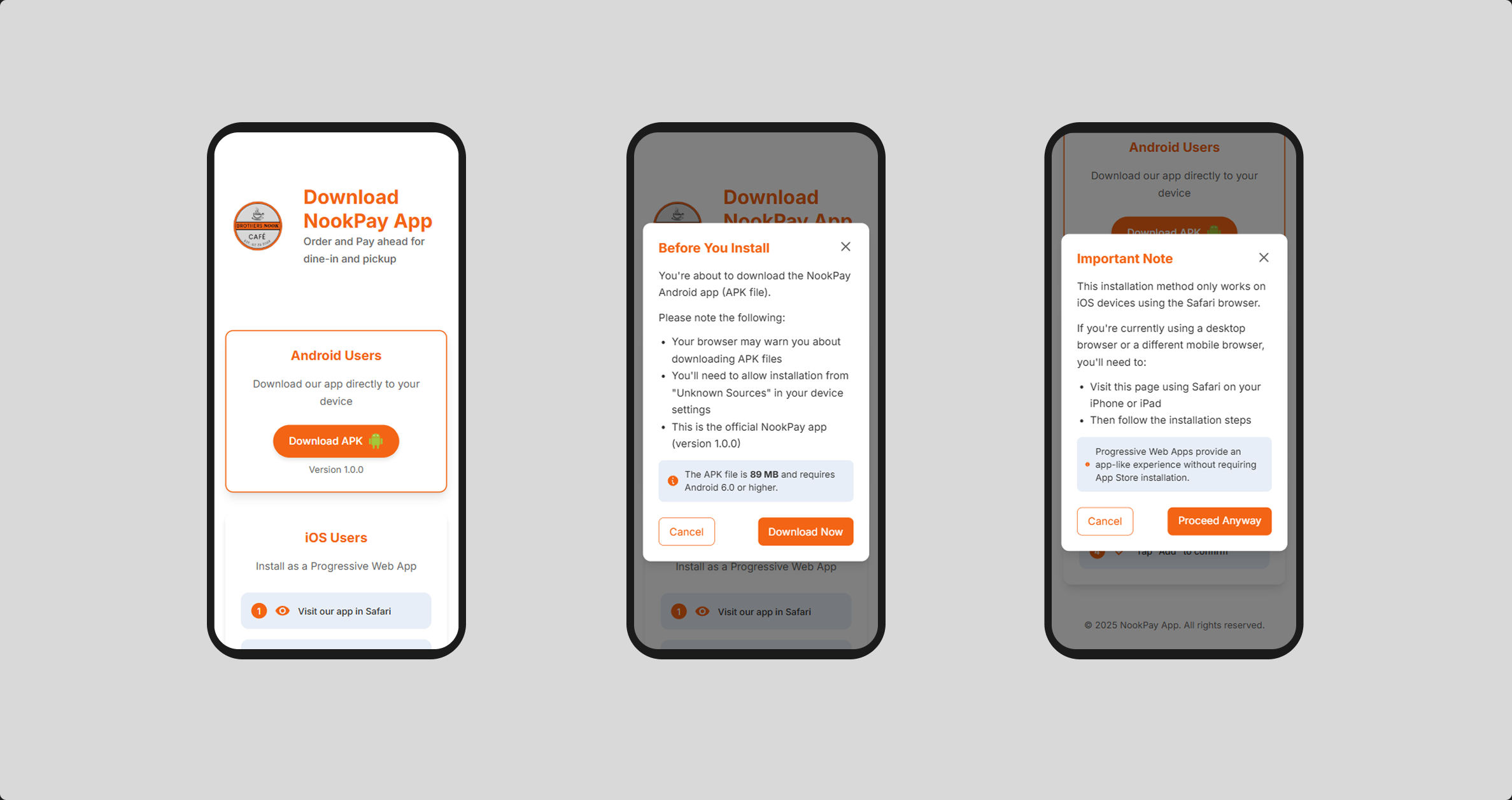 A modern, responsive web application built with vanilla HTML, CSS (Tailwind), and JavaScript that serves as a cross-platform download portal for the NookPay Ordering App, featuring smart device detection, interactive modal dialogs, and seamless APK downloads for Android users alongside Progressive Web App installation guides for iOS users, demonstrating expertise in frontend development and user experience design.