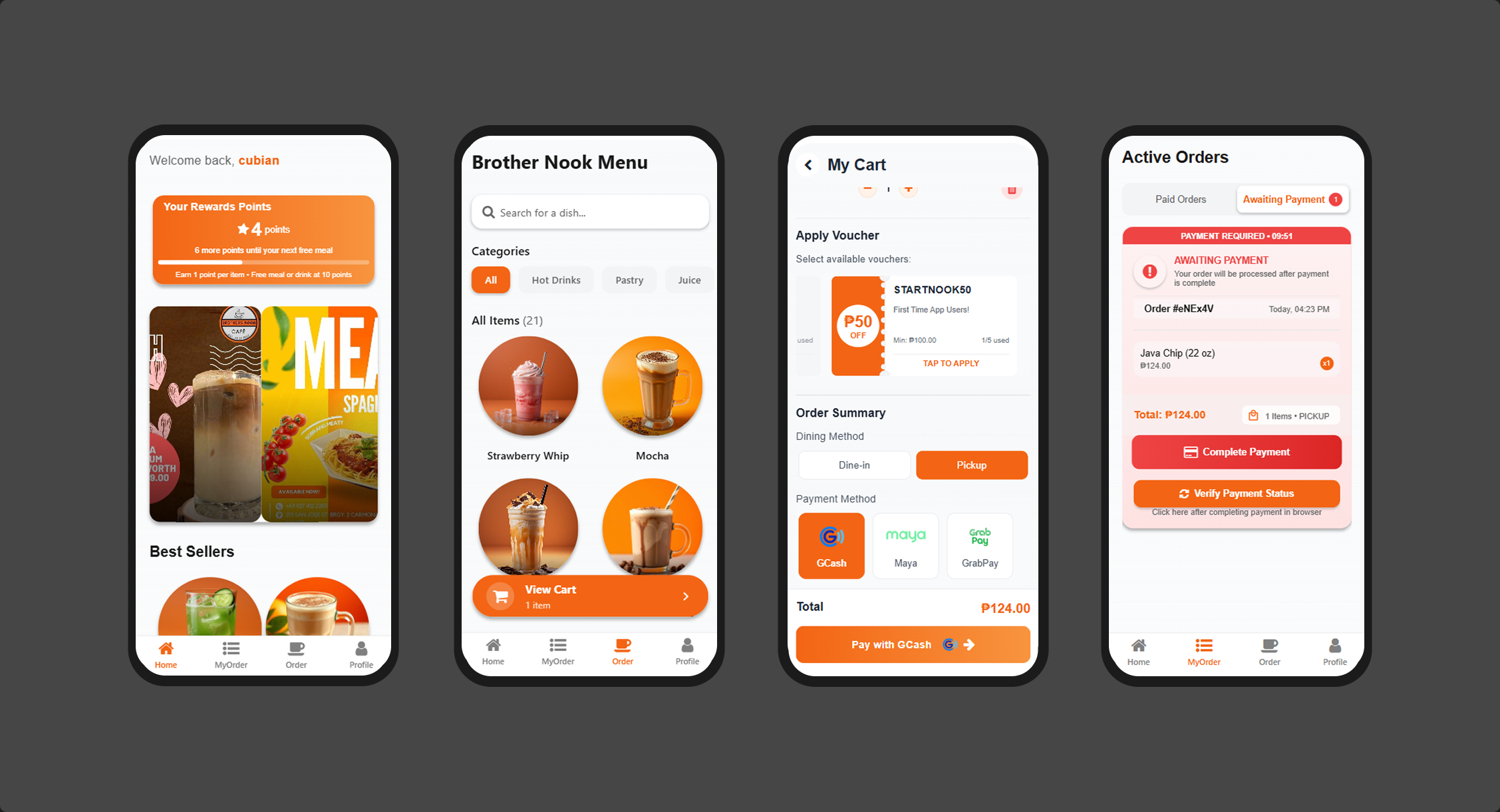 A food ordering app built with React Native Expo that lets users browse menus, add items to cart, place orders, and pay securely using PayMongo payment system, connected to the NookPay POS app for restaurant management, with features like user accounts, order tracking, vouchers, and loyalty points.